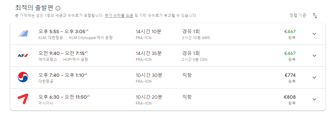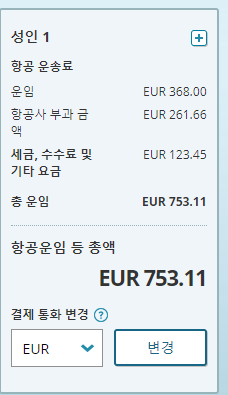 대한항공 공홈에서 사는경우 754 유로.. 한화로 약 100만원 정도이다. .. 그런데 항공운임에서 할인을 받는거기 때문에 만약 저 티켓을 선불항공권으로 이코노믹 티켓으로 구매한다면 예상 구매액?은 다음과 같다.