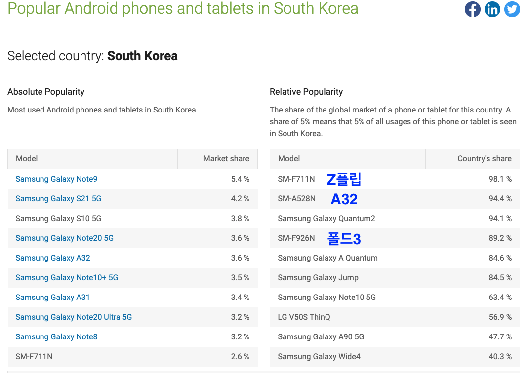 Top Android devices by country - South Korea (KR). This page lists the most popular phone models (and tablets, TVs, etc.) in South Korea. Also, you can see how important South Korea is for the market of a given device.