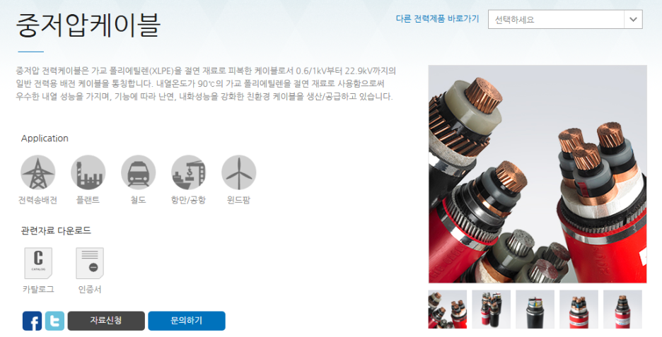 - 전력선 부문: 중저압 케이블, 산업용 특수케이블, 방화케이블 등.
