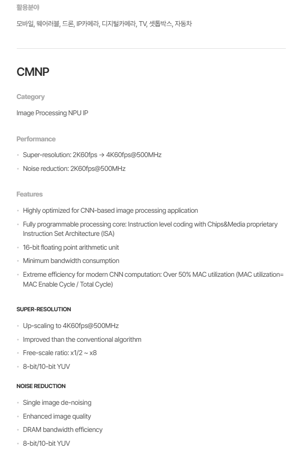- AI 반도체 시장 진출: 2023년 AI 반도체용 NPU IP 'CMNP'를 개발하여 AI 칩 시장에 진출했으며, 스마트폰, 자동차, 드론, CCTV 등 다양한 분야에 적용 가능함.