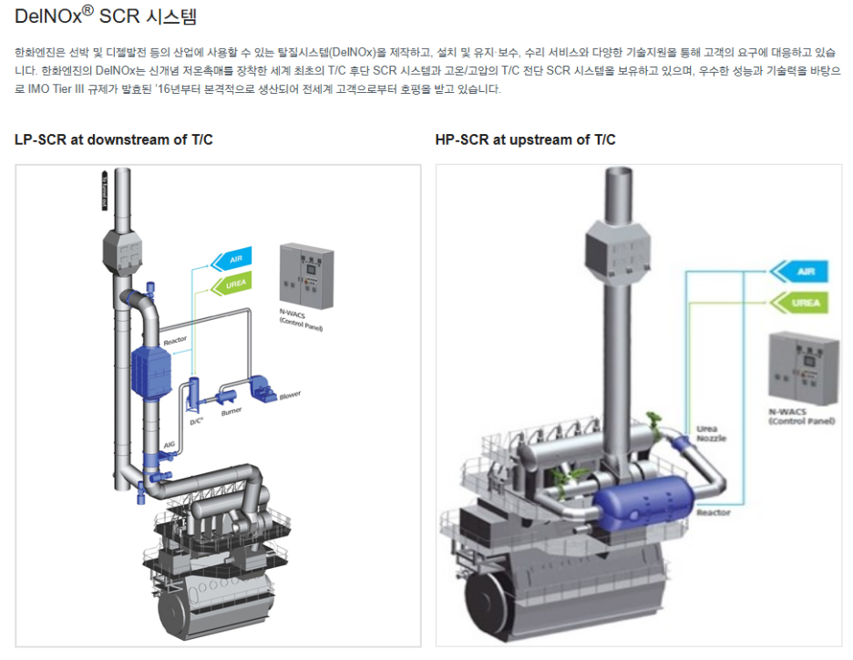 한화엔진은 700마력에서 11만 5천 마력에 이르는 선박용 중·저속 디젤 엔진을 생산하고 있음. 세계 선박용 엔진 생산 Top Maker로서 저속엔진 시장점유율 세계 2위를 유지하고 있음. 엔진 설계, 생산, 판매부터 애프터 서비스로 이어지는 일관된 서비스 체제를 구축하고 있음. 연간 14백만 마력에 이르는 세계 Top 수준의 생산 능력을 보유하고 있음. SCR 사업은 독자적인 기술로 개발한 친환경 탈질시스템(DelNOx)을 기반으로 하며, 선박엔진과 패키지로 수주하거나 개별적으로 수주하는 방식으로 운영됨. 특히 이 시스템은 낮은 온도에서도 질소화합물을 90% 이상 제거할 수 있는 세계 최초의 선박용 저온 탈질시스템으로, IMO-TierⅢ 규제에 맞춰 개발되음.
