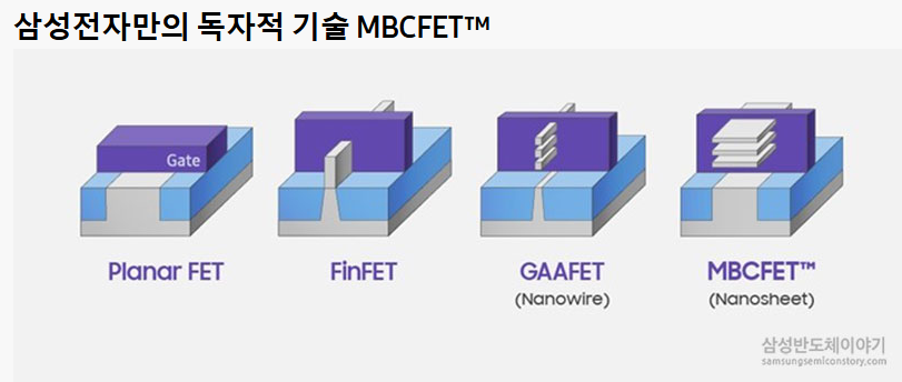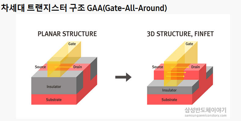 - GAA(Gate All Around) 기술: 2022년 6월 세계 최초로 3나노미터 공정에 적용한 트랜지스터 구조 개선 기술로, 게이트가 채널을 전방위로 감싸 전류 흐름을 세밀하게 제어함.